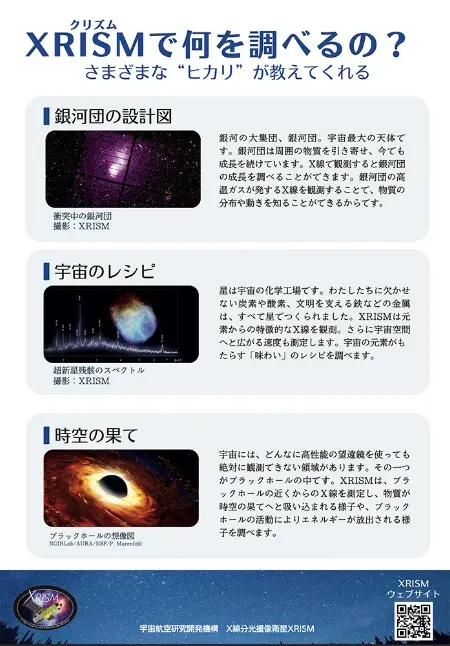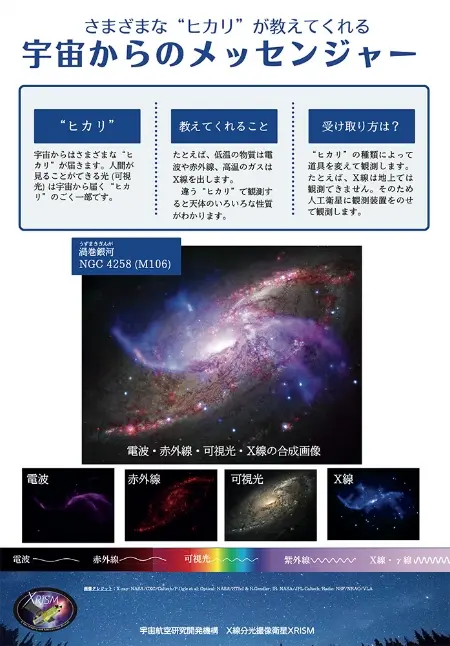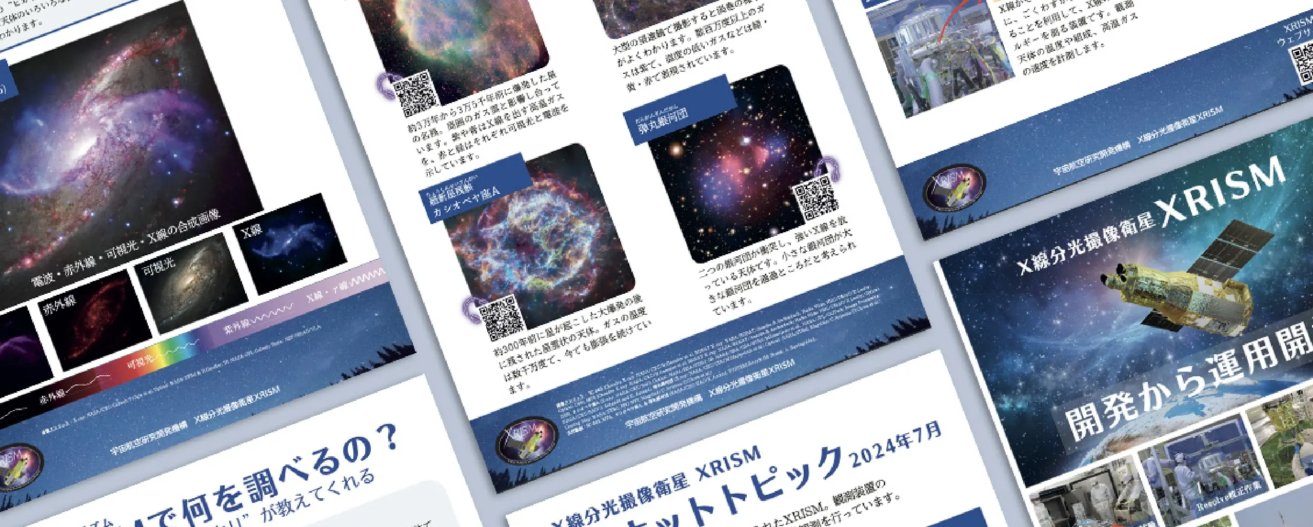 X線天文学やXRISMを紹介する展示パネルを制作し、展示パネルのデータを公開しました。小学校高学年以上向けの展示パネルです。科学館・プラネタリウム・天文台・学校などで自由にご利用いただけます。展示パネルはA1サイズで印刷することを想定しています。