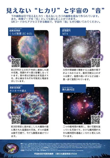 「画像」と「音」で超新星残骸や銀河、銀河団を楽しんでいただく展示パネルです。画像データから作られた「音」は展示パネルに掲載したQRコードから聴いていただくことができます。